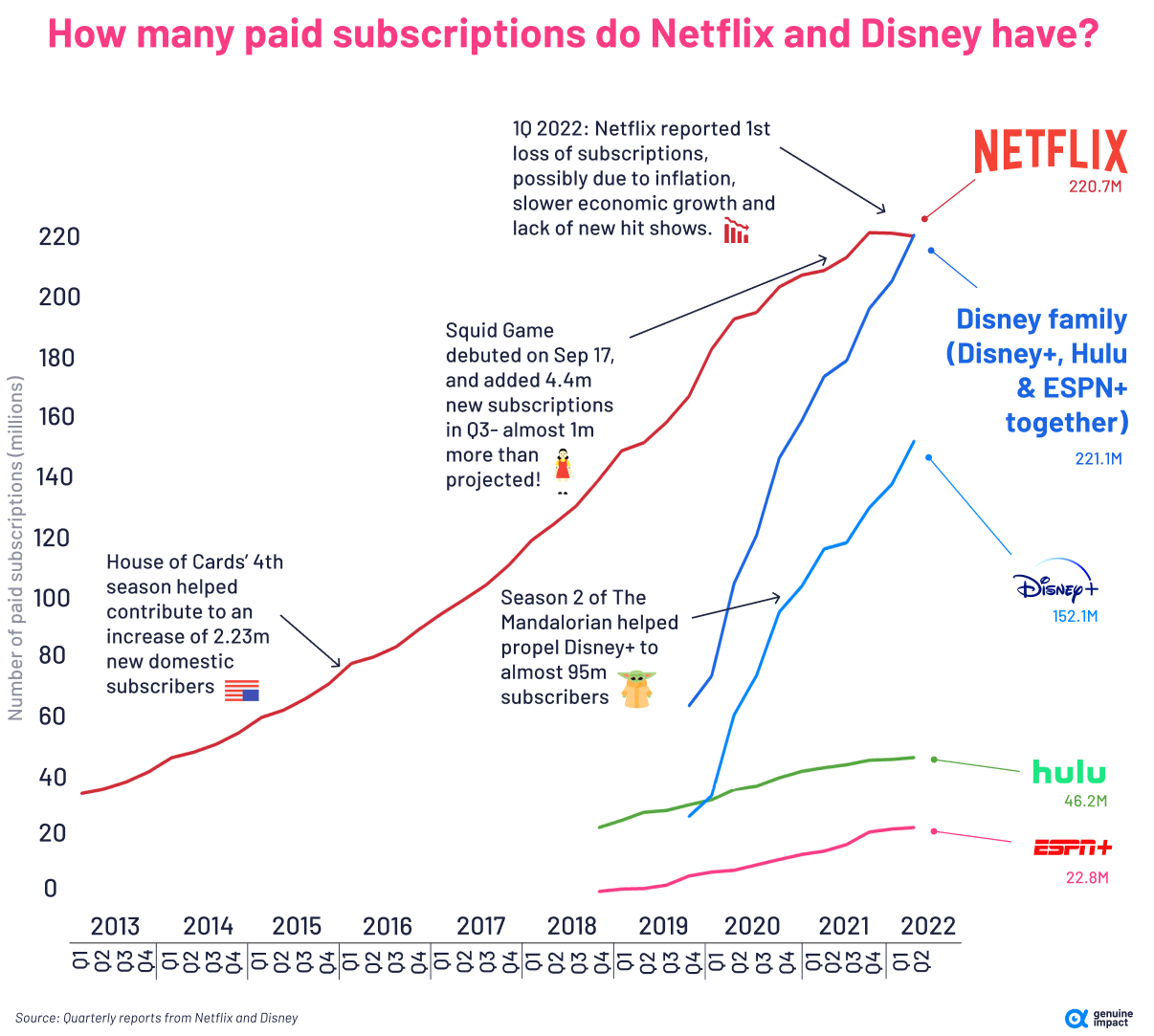 La Walt Disney Company si è lanciata nello streaming dal 2009, prima partecipando alla piattaforma Hulu come azionista di minoranza, poi acquisendo nel 2016 una partecipazione del 33% in BAMTECH Media, società di tecnologia per lo streaming video, successivamente acquistata e ribattezza, nel 2018, Disney Streaming Services. Oltre al lancio di ESPN+ e soprattutto di Disney+, l’acquisizione di 21 Century Fox ha dato Disney una quota di maggioranza anche in altre piattaforme di streaming, tra cui Hulu e Star+. Calcolati tutti insieme, nel secondo trimestre 2022 i servizi streaming controllati direttamente o indirettamente da Disney sono riusciti ad effettuare il fatidico sorpasso di Netflix per numero di abbonati (221,1 milioni vs 220,7).