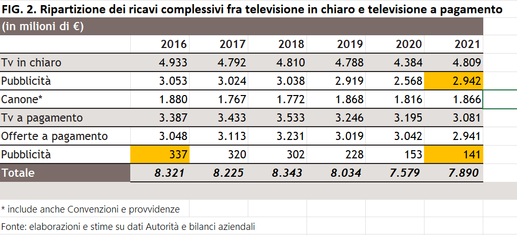 Attualmente, il mercato della pubblicità televisiva in Italia ammonta a circa 3 miliardi di euro l’anno. Salvo il calo del 2020, i ricavi negli ultimi 6 anni risultano relativamente stabili. Il mercato della tv a pagamento ha visto invece un decremento di circa il 10%, dovuto in buona parte anche alla riduzione della componente pubblicitaria. Infatti, se le offerte a pagamento sono passate da 3.048 milioni del 2016 a 2.941 milioni nel 2021, la raccolta pubblicitaria sulla piattaforme pay è più che dimezzata, da 337 a 141 milioni. Peraltro, questa viene ancora veicolata in modalità broadcast, ovvero senza una profilazione ad personam ma in relazione al contenuto e alla fascia oraria.