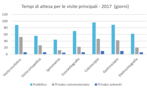 Sia l’Ocse nel 2020, sia la Commissione Europea hanno evidenziato come il problema dei tempi di attesa fosse un tema di preoccupazione considerevole nella maggior parte dei paesi dell’Unione Europea. In Italia non esiste un sistema centralizzato di raccolta sistematica e pubblicazione dell’andamento delle prestazioni sanitarie, l’onere di pubblicare e rendere consultabili i dati sulle liste d’attesa è lasciato alle regioni. Gli ultimi numeri disponibili sono stati raccolti nel 2017 da CREA Sanità con riferimento a quattro SSR: Lombardia, Veneto, Lazio e Campania. Tuttavia questo studio mostrato dal grafico 1.1 è sufficiente per denotare il fenomeno dei tempi di attesa del servizio sanitario pubblico, a differenza del privato che può permettersi un servizio più efficiente.