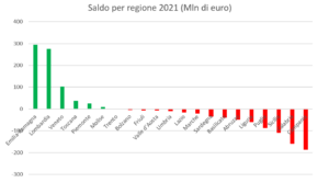 Il fenomeno dell’esodo da Sud a Nord per curarsi non si arresta. Sono ben 14 le regioni che hanno infatti saldi negativi. Fanalini di coda sono la Campania che nel 2021 registra un saldo negativo di 185,7 mln. A seguire la Calabria (-159,5 mln), la Sicilia (-109,6 mln), la Puglia (-87,6 mln), la Liguria (-60,7 mln), l’Abruzzo (-49,5 mln), la Basilicata (-40,3 mln), la Sardegna (-34,4 mln), le Marche (-21,1 mln), l’Umbria (-9,8 mln), la Valle d’Aosta (-7,1 mln), il Friuli Venezia Giulia (-6,8 mln), la Pa di Bolzano (-4,3 mln) e la Pa di Trento (-0,03 mln). In attivo a guadagnarci di più dalla mobilità è nel 2021 l’Emilia Romagna che scalza la Lombardia dal vertice con un saldo attivo di 293,9 mln. Lombardia che segue con un +274,9 mln. In attivo anche il Veneto (+102 mln), la Toscana (+38,1 mln), il Lazio (+34,2 mln), il Piemonte (24,8 mln) e il Molise (+8,7 mln).