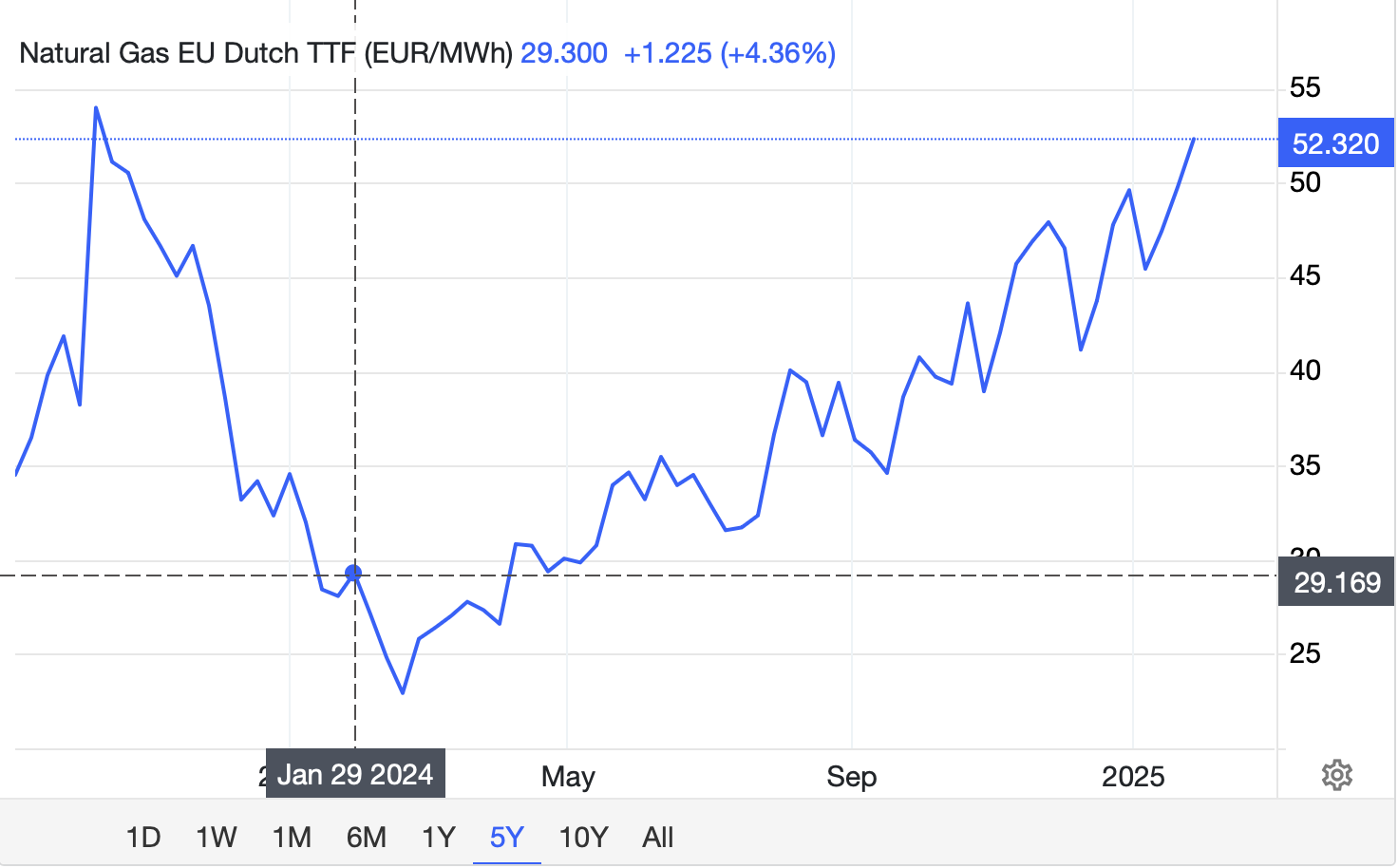 Il prezzo del gas naturale in Unione Europea (UE) è arrivato a 50-52 euro per megawattora (€/MWh), quasi al livello del picco di ottobre 2023, relativo allo shock energetico conseguente alla crisi in Medio Oriente tra Israele e Hamas. Al contrario, i prezzi durante l’anno scorso si sono mantenuti relativamente bassi: il 29 gennaio 2024, esattamente un anno fa, il TTF si attestava a 29 €/MWh. Eppure, già nel terzo trimestre 2024 si registrava una media di 36 €/MWh, con un aumento del 7% dei prezzi del gas all’ingrosso in Europa rispetto allo stesso periodo dell’anno precedente.