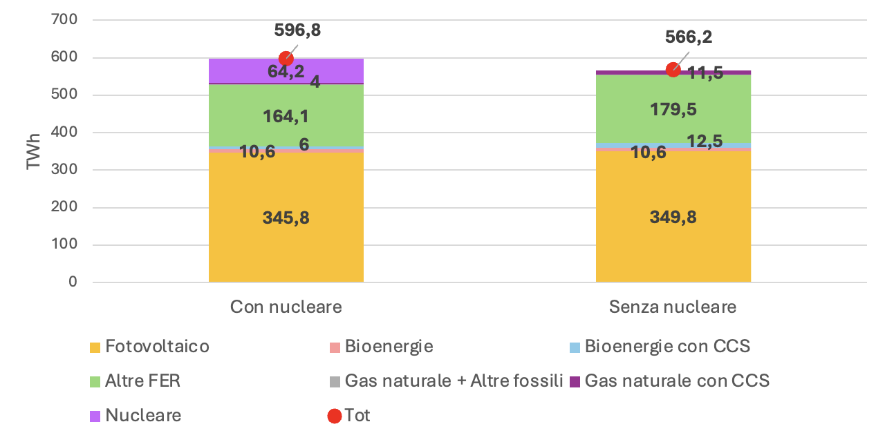 Figura 3: Produzione nazionale di energia elettrica al 2050 negli scenari con e senza nucleare