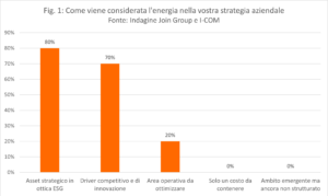 La prima domanda dell’indagine concerne la percezione dell’energia all’interno delle strategie aziendali degli intervistati (Fig.1). A tal proposito, l’80% ha risposto che essa è vista come asset strategico in ottica ESG, mentre per il 70% rappresenta un driver competitivo e di innovazione. Più bassa la percentuale di chi la considera un’area operativa da ottimizzare (20%), mentre nessuno ha espresso un giudizio negativo (solo un costo da contenere/ambito emergente ma ancora non strutturato).