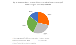 Un’altra parte del questionario riguarda esplicitamente i modelli di business e le collaborazioni. In questo senso, la maggior parte degli intervistati (42,86%) ha dichiarato di non avere in programma l’offerta di servizi o bundle integrati telco-energy. Peraltro, il 28,57% dei rispondenti è già attivo su questo mercato, mentre il restante 28,58% ha questa attività in fase di progettazione o comunque lo considera come un tema strategico da tenere sotto osservazione in futuro. Sempre in riferimento al rapporto telco-energy negli ultimi anni si stanno sviluppando modelli sempre più diversificati. Il 25% dei rispondenti agisce mediante offerta di connettività e fornitura di energia, un ulteriore 25% mediante servizi di energy management ed infine il restante 50% ha adottato un modello di reseller o la digitalizzazione delle cabine primarie e secondarie. Inoltre, il 28,57% ha già attivato partnership con aggregatori/flexibility service provider del settore energia e la medesima quota sta valutando questa opzione oppure ha dichiarato di non avere alcuna collaborazione attiva al momento, non facendo presagire alcuna possibilità in tal senso. Il restante 14,29% ha risposto di averlo già fatto con utility, quali ad esempio Enel, Hera ed A2A (Fig. 4).