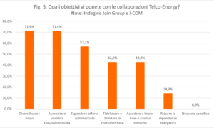 La survey sottolinea poi come gli obiettivi della collaborazione possono essere molteplici (Fig. 5). Oltre il 70% delle telco ha indicato come fine la diversificazione dei ricavi conseguente all’espansione su nuove linee di business, come pure l’aumento della visibilità connessa ai criteri ESG/sostenibilità. Una quota inferiore ha individuato nell’espansione dell’offerta commerciale (57,1%), nella fidelizzazione dei clienti (42,9%), nonché nell’accesso al know-how e alle risorse tecniche (42,9%) e alla riduzione della dipendenza energetica (14,3%) ulteriori finalità di questa partnership.