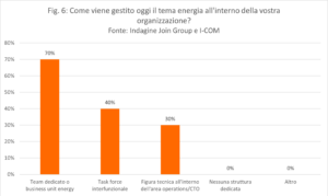 Un ulteriore aspetto rilevante riguarda la governance e le competenze presenti all’interno dei business aziendali. In relazione alla prima, il 70% dei rispondenti ha dichiarato che ad occuparsi del tema dell’energia è un team dedicato o una business unit energy, mentre la restante quota si divide tra chi ha attivato una task force interfunzionale oppure una figura tecnica all’interno dell’area operations/CTO (Fig. 6). Inoltre, è opportuno evidenziare che nessuna delle aziende intervistate (sia telco che vendor) ha selezionato l’opzione “Nessuna struttura dedicata”, il che indica una certa attenzione del settore verso questi temi.