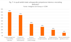 Invece, sul versante delle competenze l’80% delle aziende ha risposto di stare sviluppando quelle nell’ambito energy management e sostenibilità operativa, il 70% in quella energy data analytics/IA per l’ottimizzazione delle risorse (Fig. 7). Più ridotte le percentuali di chi sta insistendo nei campi del business development in ambito energia (40%), nella regolazione energetica e policy (30%) e nella progettazione e gestione di impianti (20%). Solamente il 10% ha risposto di non aver alcun investimento specifico in fase di sviluppo.