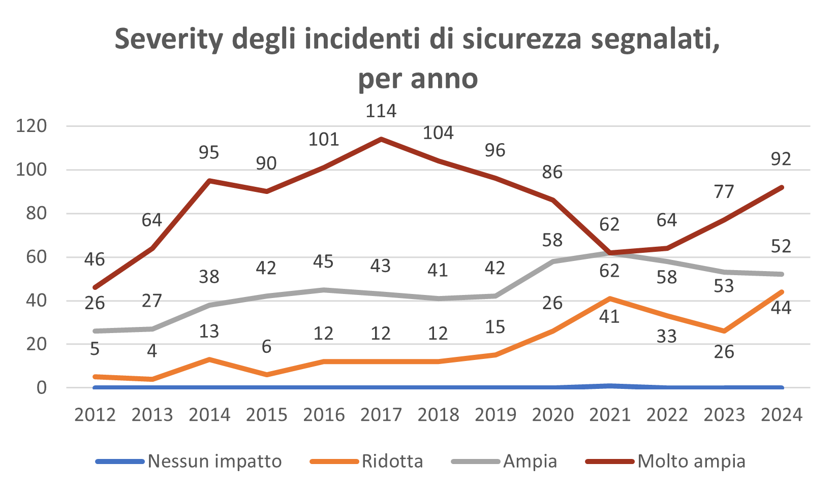 Altro dato interessante è quello relativo alla severity su base annua, in quanto dal 2021 sta costantemente aumentando la quota di incidenti con impatto molto ampio (ossia i più gravi), che nel 2024 hanno toccato quota 92 contro i 77 dell’anno precedente. Diversamente, gli incidenti con impatto ampio hanno raggiunto il picco nel 2021 (62), decrescendo fino ai 52 registrati durante l’ultima rilevazione, mentre quelli con impatto ridotto (i meno gravi) sono tornati a salire sui livelli del 2021.