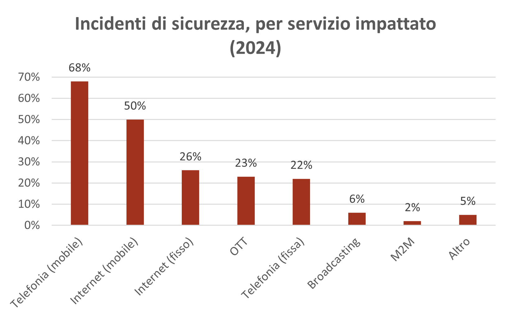 La maggior parte degli incidenti di sicurezza significativi segnalati nel 2024 ha riguardato i servizi di telefonia mobile (68%), seguiti da internet mobile (50%), internet fisso (26%) e OTT (23%). Viceversa, chiudono questa classifica i servizi connessi alla telefonia fissa (22%), al broadcasting (6%) e, in ultimo, alle interazioni M2M (Machine to Machine) (2%). Inoltre, è opportuno evidenziare come la maggior parte degli incidenti segnalati ha impattato su più di un servizio, quindi la somma delle percentuali supera il 100%.