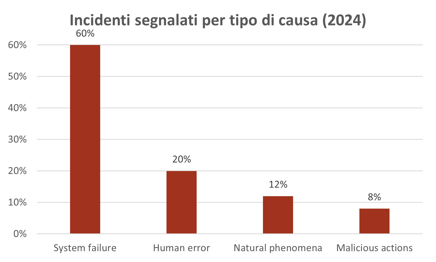 Quanto al tipo di causa, il report dell’ENISA opera una distinzione in quattro categorie: system failure, human error, malicious actions e natural phenomena. Ebbene, nel 2024 il numero di incidenti di sicurezza legati al system failure ha raggiunto il 60%, registrando un lieve decremento rispetto al 2023 (-1%). Al secondo posto, con un sostanziale distacco rispetto ai primi, si collocano gli incidenti riconducibili a un errore umano (20%), similmente a quanto osservato nella precedente rilevazione. Seguono, i fenomeni naturali (12%; +5% su base annua) e le azioni malevole (8%; -2%).