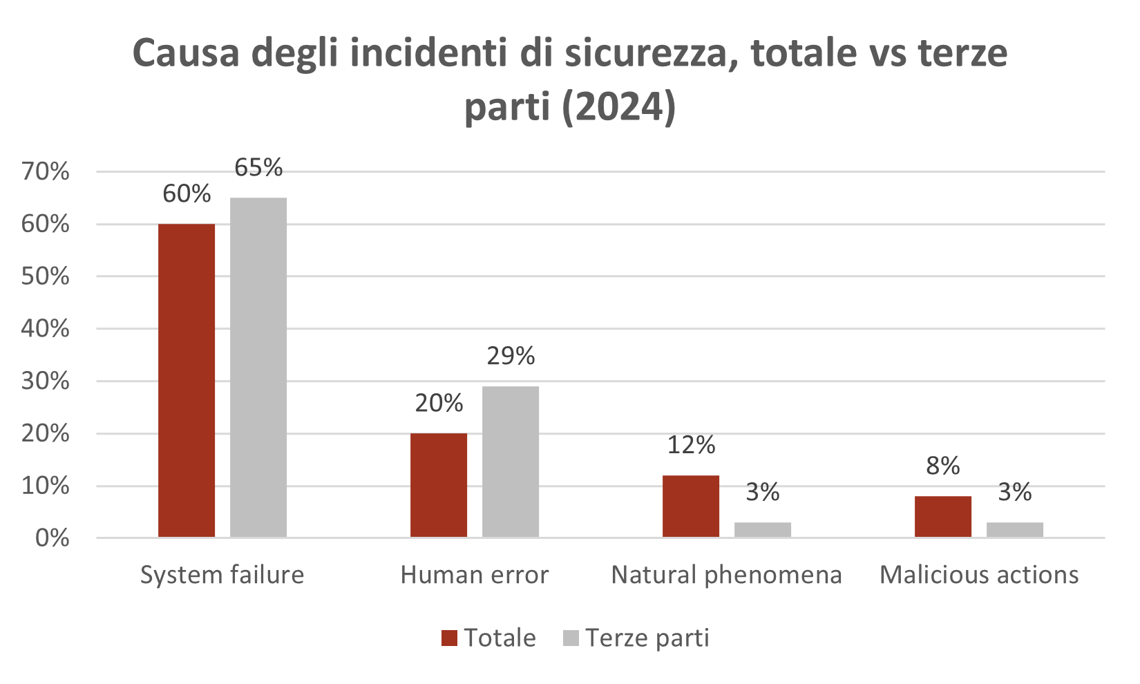Nel 2024, 65 degli 188 incidenti segnalati sono stati attribuiti a malfunzionamenti causati da terze parti, rappresentando il 37% del totale, rispetto ai 38 incidenti segnalati nel 2023, che costituivano il 24% del totale. La maggior parte delle segnalazioni, pari al 65% di questa sottocategoria, ha avuto origine da guasti di sistema, seguiti da errori umani (29%), azioni malevole e fenomeni naturali (entrambi al 3%). Simili risultati, se confrontati col totale degli incidenti di sicurezza, indicano chiaramente che le terze parti incorrono maggiormente in guasti di sistema (+5% rispetto al totale considerato) e soprattutto in eventi associabili all’errore umano (+9%), palesando pertanto un tema da attenzionare.