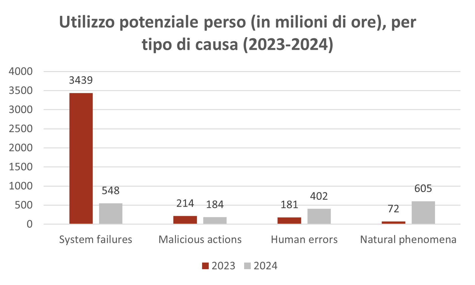 Ciò premesso, nel 2024 primeggia l’utilizzo potenziale perso riconducibile a natural phenomena (605 milioni di ore), seguito da system failures (548 milioni), human errors (402 milioni), e, infine, da malicious actions (184 milioni). Tuttavia, è opportuno evidenziare che nel caso degli incidenti riconducibili a guasti di sistema e azioni malevole si tratta di un importante decremento su base annua (rispettivamente dell’84% e 14%), che risulta particolarmente marcato per i primi (nel 2023 si trattava di 3,4 miliardi di ore potenzialmente perse). Negli altri due casi, invece, si registra un incremento rilevante. Quest’ultimo equivale addirittura al 122% nel caso degli incidenti di sicurezza derivanti da un errore umano e addirittura al 740% quando la causa è rintracciabile in un fenomeno naturale.