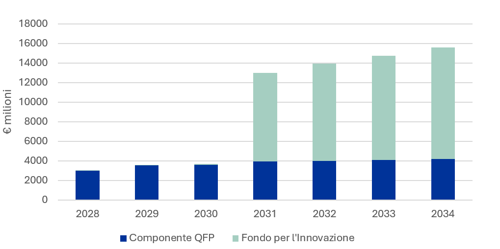 Considerando anche il Fondo per l’Innovazione, lo strumento InvestEU e il Programma Horizon Europe, il Fondo Europeo per la Competitività dispone complessivamente di 450,5 miliardi di euro a prezzi correnti per il periodo 2028-2034. La sezione dedicata a “Transizione pulita e decarbonizzazione industriale” conta su risorse totali pari a 67,4 miliardi di euro: di questi, 26,2 miliardi provengono direttamente dal QFP come nuove risorse proprie allocate nel Fondo per la Competitività, mentre i restanti 41,2 miliardi sono forniti dal Fondo per l’Innovazione.