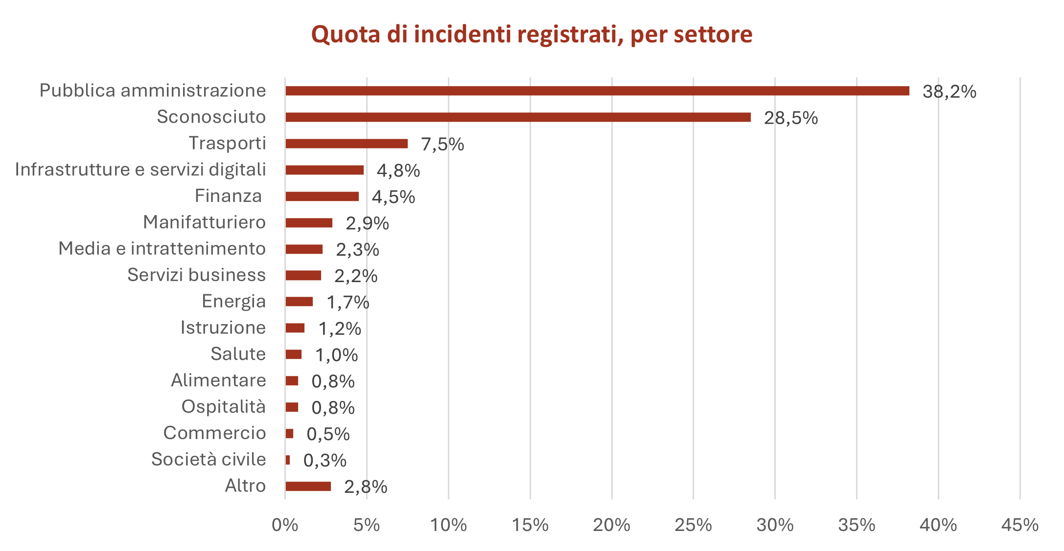 In questo quadro, il rapporto ENISA Threat Landscape 2025, pubblicato lo scorso primo ottobre, ha raccolto e analizzato 4.875 incidenti di cybersicurezza nel periodo che va dal 1° luglio 2024 al 31 giugno 2025. Ebbene, se si analizzano gli incidenti per settore, si osserva che il 28,5% del totale non è associabile a un comparto specifico. Escludendo questi casi, i cinque settori maggiormente colpiti risultano essere: la pubblica amministrazione (38,2%), i trasporti (7,5%), le infrastrutture e servizi digitali (4,8%), la finanza (4,5%) e il manifatturiero (2,9%).