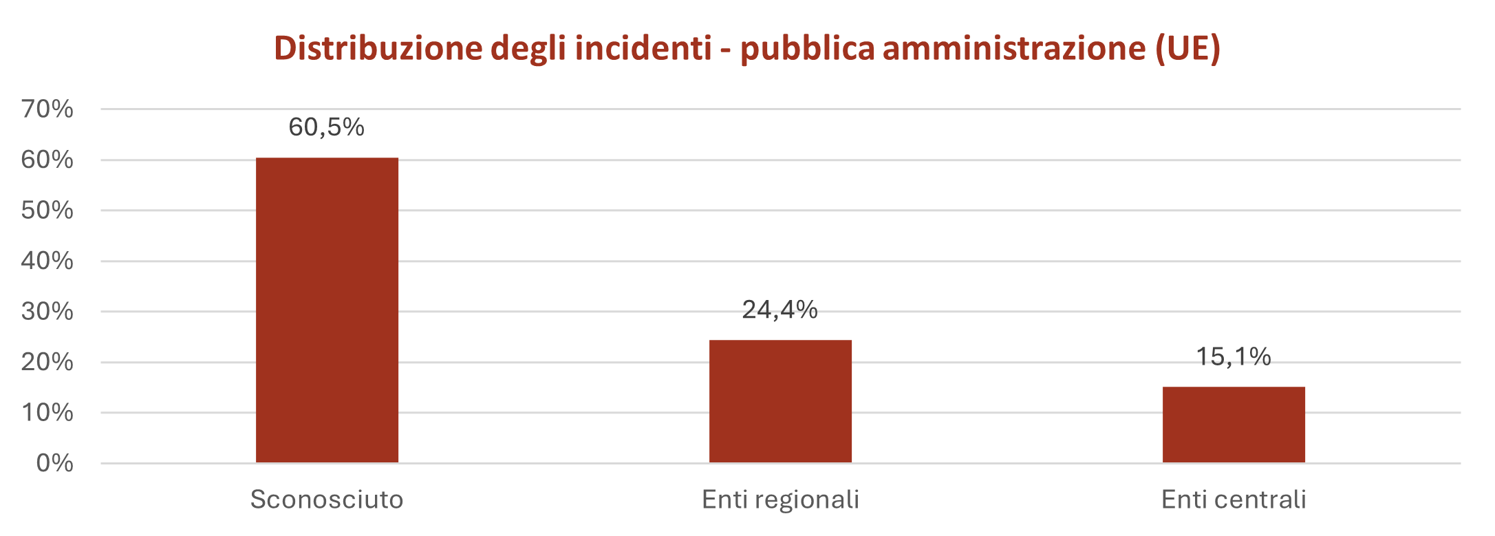 Analizzando la distribuzione degli incidenti di cybersicurezza che hanno coinvolto la pubblica amministrazione, emerge che gli enti regionali risultano essere quelli più colpiti, totalizzando il 24,4% del totale, seguiti dagli enti centrali, che registrano il 15,1%. Inoltre, secondo i dati ENISA, l’Italia si colloca al secondo posto in Europa per numero di incidenti nella PA, con una quota del 26,3%, subito dopo la Francia, che guida la classifica con il 27%.