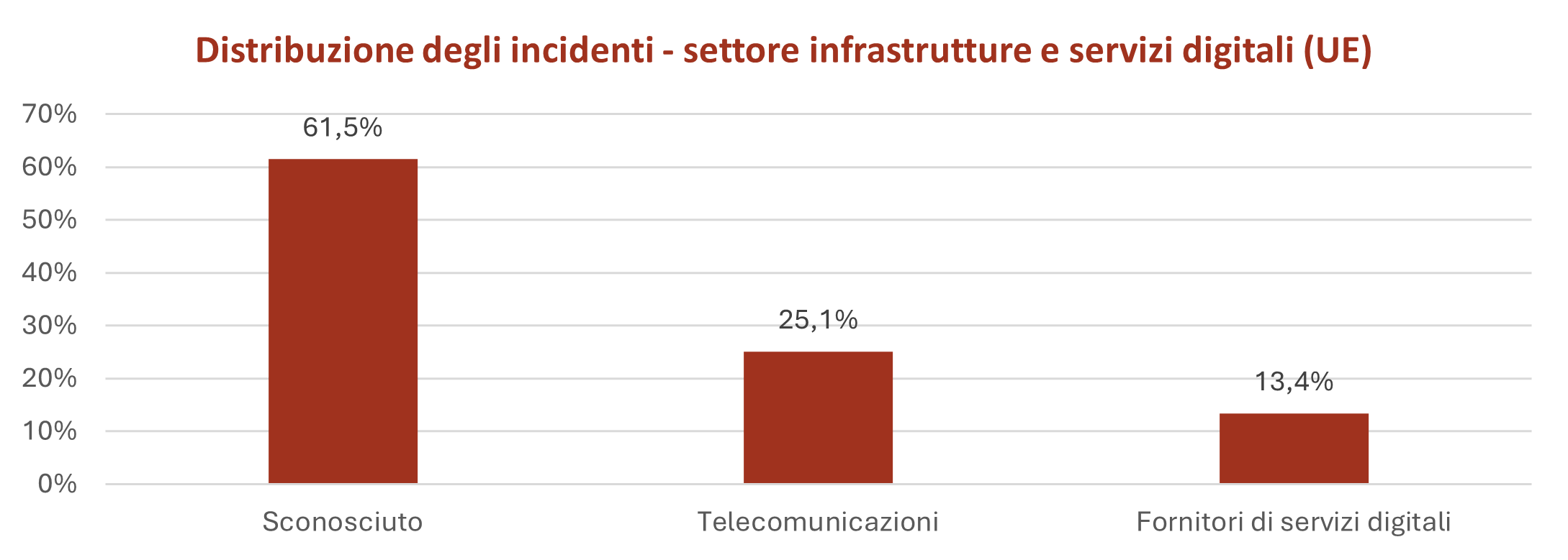 Nel settore delle infrastrutture e servizi digitali, il comparto più colpito è quello delle telecomunicazioni con 25,1% degli incidenti totali nel settore. Si tratta di un dato particolarmente significativo in quanto riflette la crescente esposizione delle reti di comunicazione alle minacce cibernetiche. A seguire poi, con una quota comunque rilevante, si trovano i fornitori di servizi digitali con il 13,4%.