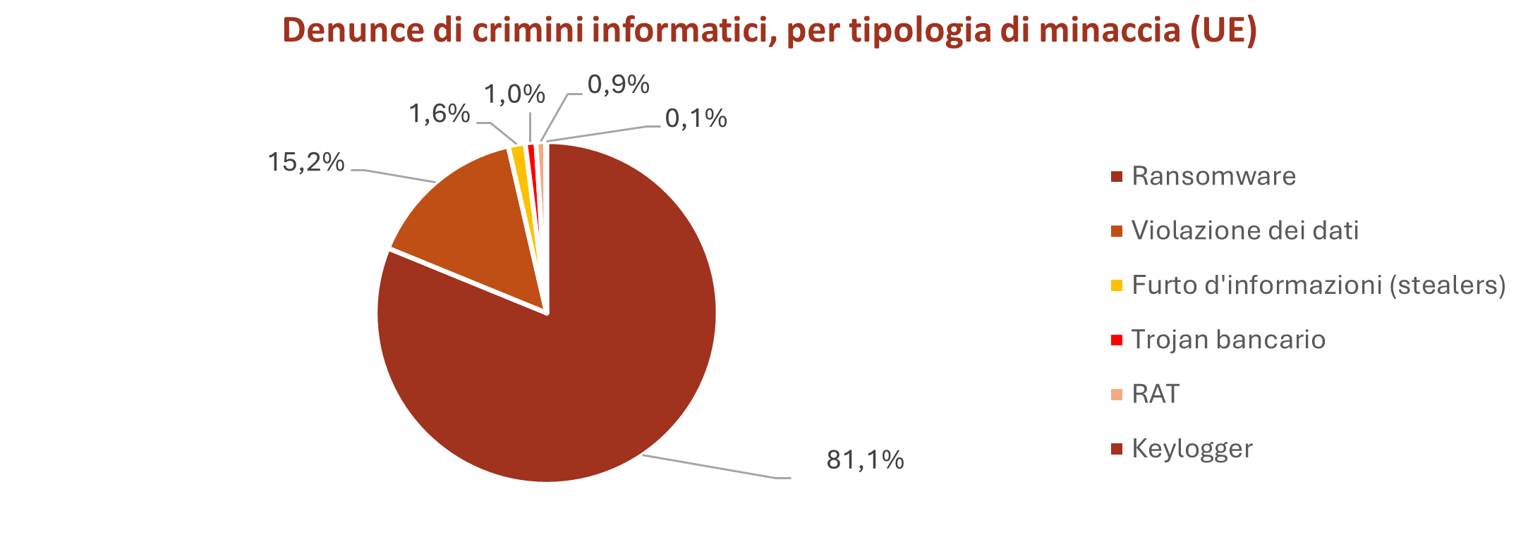 Dopo aver analizzato la distribuzione degli incidenti nei vari settori, risulta rilevante capire quali sono gli incidenti più frequenti derivanti dalle azioni malevole perpetrate, in particolare, dai cybercriminali. Questi ultimi, nell’81,1% dei casi utilizzano gli ormai tristemente noti ransomware, a cui seguono – con un importante distacco – le violazioni di dati, che rappresentano il 15,2% del totale delle segnalazioni. Di conseguenza, le altre categorie individuate dal rapporto di ENISA, come stealers, trojan bancari, RAT e keylogger raccolgono una quota residuale piuttosto esigua, pari al 3,7%.