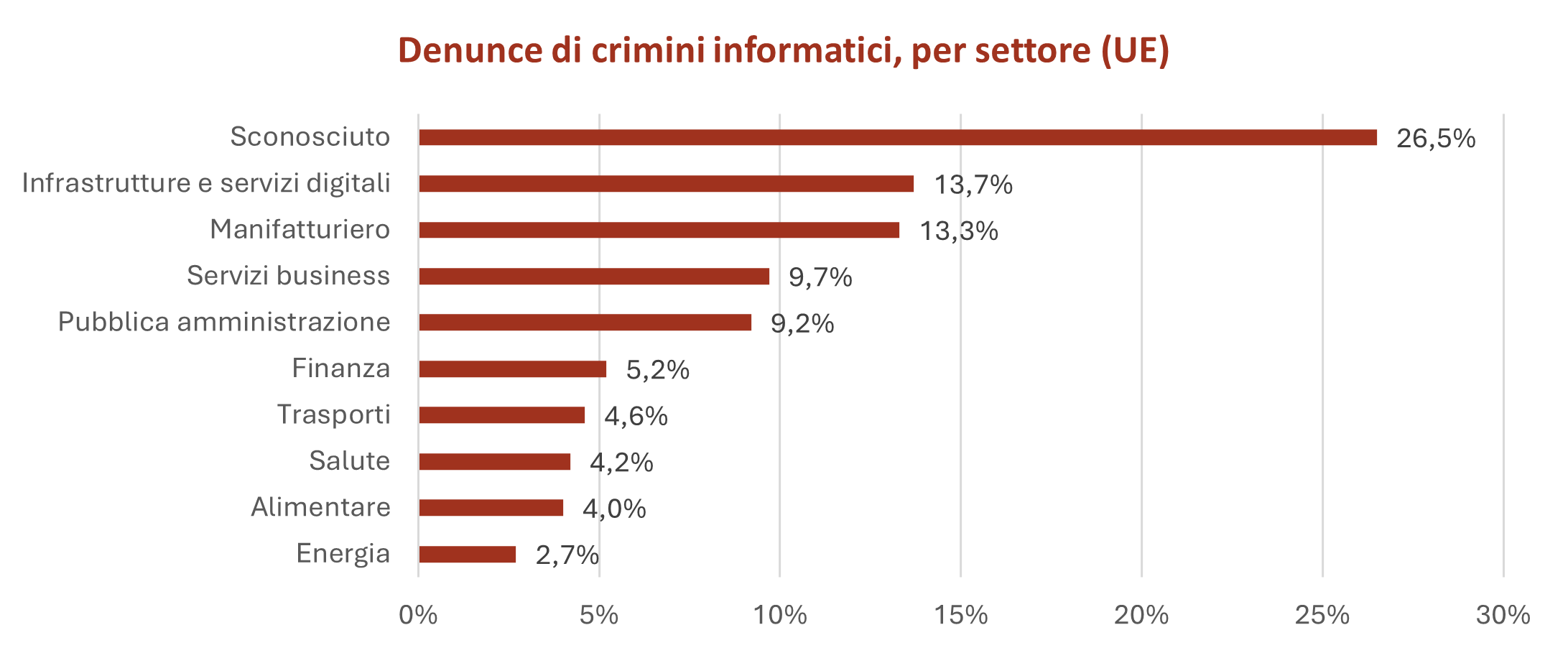 Dopo aver delineato la tipologia di attacchi più frequenti, è altrettanto significativo osservare quali settori risultano maggiormente colpiti. Le attività di criminalità informatica continuano infatti a interessare un’ampia gamma di comparti nell’Unione europea, sia all’interno del perimetro NIS2, sia al di fuori di esso. Nel periodo di riferimento, il settore delle infrastrutture e dei servizi digitali si conferma il principale bersaglio (13,7%), seguito dal manifatturiero (13,3%), dai servizi business (9,7%) e dalla pubblica amministrazione (9,2%).