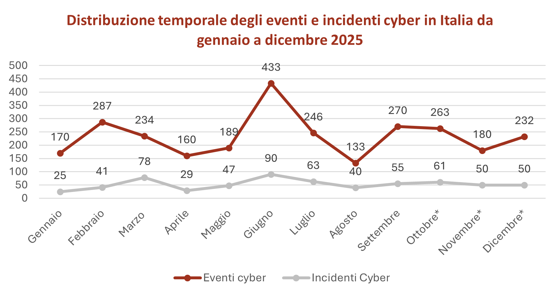 In questo contesto le evidenze contenute nel rapporto ENISA trovano riscontro anche a livello nazionale. Lo scorso 17 ottobre l’Agenzia per la Cybersicurezza Nazionale (ACN) ha pubblicato il report mensile “Operational Summary” aggiornato a settembre 2025, che raccoglie i dati e gli indicatori mensili sull’analisi e l’andamento della minaccia cibernetica, concentrandosi sui principali settori merceologici impattati e le tipologie di minacce più frequenti. In particolare, si rileva che dopo il picco di giugno, con ben 433 eventi cyber, nei mesi successivi si è registrato un importante decremento a cui è seguito un nuovo balzo a settembre. In generale, la media dei primi nove mesi dell’anno in corso è di 236 eventi e 52 incidenti, notevolmente più elevata rispetto ai valori rilevati nello stesso periodo del 2024 (rispettivamente, 159 e 37).