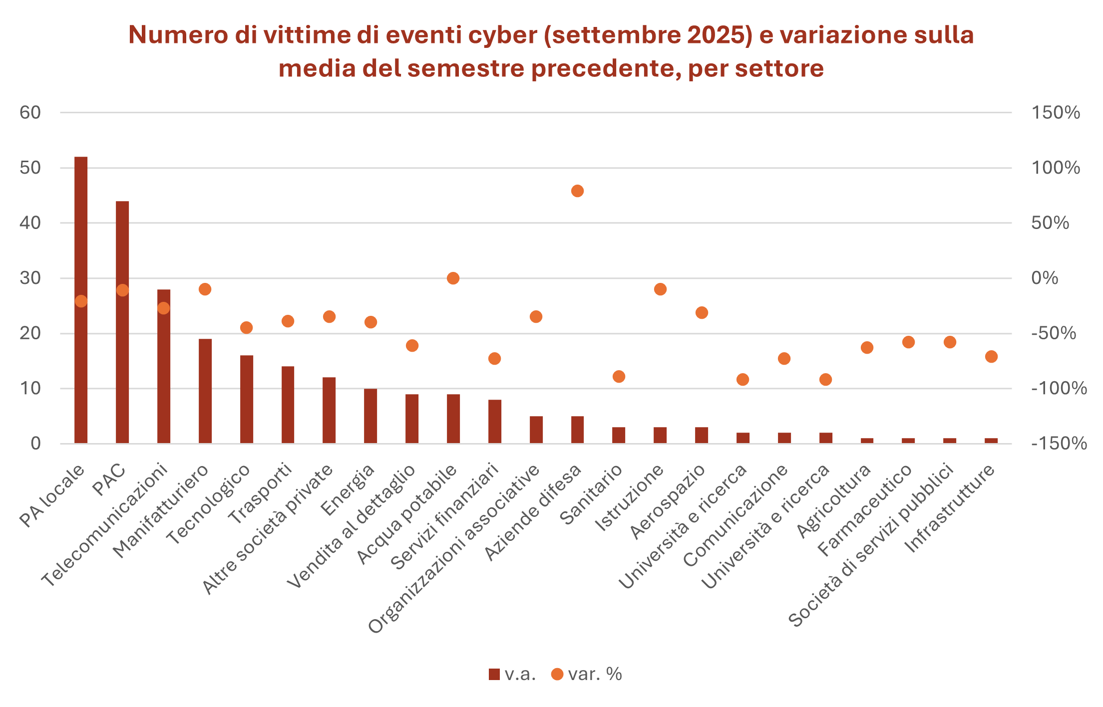 Tra i settori di attività dei soggetti target, la pubblica amministrazione nel suo insieme – locale e centrale (PAC) – è stata interessata dal 38,4% degli eventi cyber registrati dall’Agenzia a settembre 2025. Per di più, similmente a quanto visto a livello europeo, la quota maggiore è in capo agli enti locali con 52 eventi cyber (20,8% del totale nel periodo considerato), a fronte di 44 che hanno riguardato la PAC (17,6%).