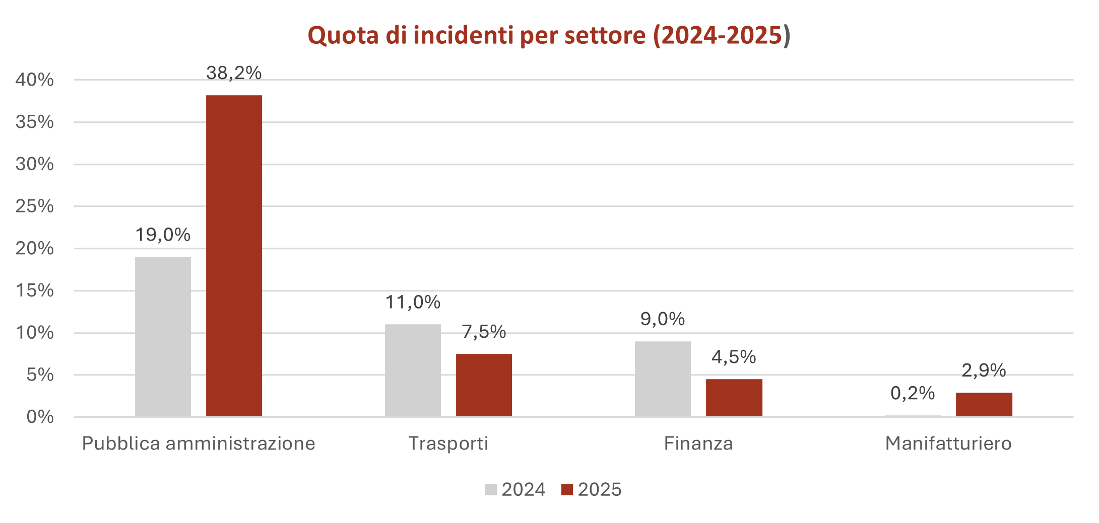 È interessante notare che nel 2025 il settore della pubblica amministrazione è stato particolarmente sotto i riflettori dal punto di vista della cybersicurezza, registrando un aumento del 19,2% su base annua. In dettaglio, nel 2024 gli incidenti hanno riguardato principalmente la pubblica amministrazione (19%), seguita dai trasporti (11%) e dalla finanza (9%). Nel 2025, invece, la quota di incidenti nella pubblica amministrazione è raddoppiata (38,2%) e aumenta sensibilmente il manifatturiero (+2,7%), mentre negli altri settori, ossia trasporti (7,5%) e finanza (4,5%), si registra un calo complessivo.