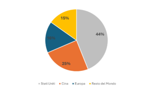 Indagando a livello geografico l’origine di questi consumi si riscontrano notevoli disomogeneità. Il 44% dell’energia elettrica consumata dai data center nel mondo fa riferimento agli Stati Uniti, dove nel maggio del 2025 si contavano più di 3600 strutture (Data Center Map). Al secondo posto per mole di consumi troviamo la Cina con una quota pari al 25% e circa 340 strutture, mentre l’Europa detiene una quota del 16%, poco superiore a quella dei restanti paesi congiuntamente.