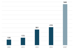 Il consumo dei data center nel mondo è cresciuto del 35% tra il 2005 e il 2015, passando da 128 a 173 TWh. Dopo quest’anno le strutture in questione hanno visto uno sviluppo sostenuto, soprattutto grazie all’avvento dell’IA. In meno di dieci anni, tra il 2015 e il 2024, la domanda energetica è infatti salita del 140%. Per quanto riguarda le prospettive future, considerando che tra il 2023 e il 2024 la crescita del consumo elettrico dei data center è stata pari al 15% e mantenendo questo valore come stima per il tasso di crescita medio annuale fino al 2030, l’IEA prevede per questa data un consumo di 946 TWh (scenario di base), ovvero un incremento della domanda proveniente dai data center dell’127% rispetto al 2024.